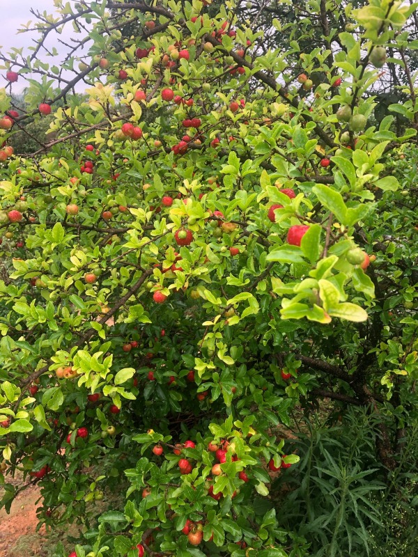 - No terreno estão plantadas várias árvores frutíferas: banana, manga (Tommy, Palmer e Ubá), ameixa, jambo, caju, amora, uva, goiaba vermelha e branca, jabuticaba, acerola, mexerica, laranja, figo e maracujá; ipês amarelos e cerca viva de tumbérgias.